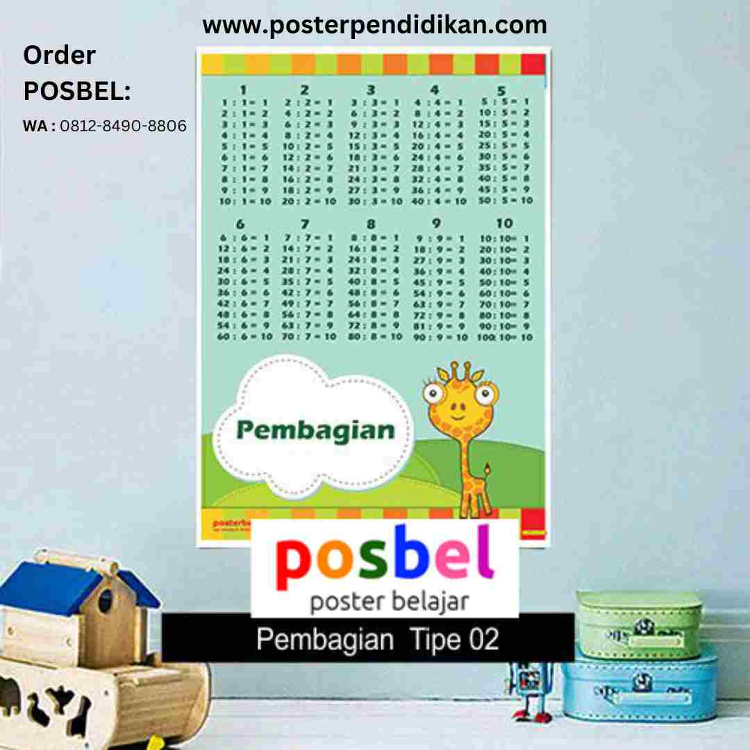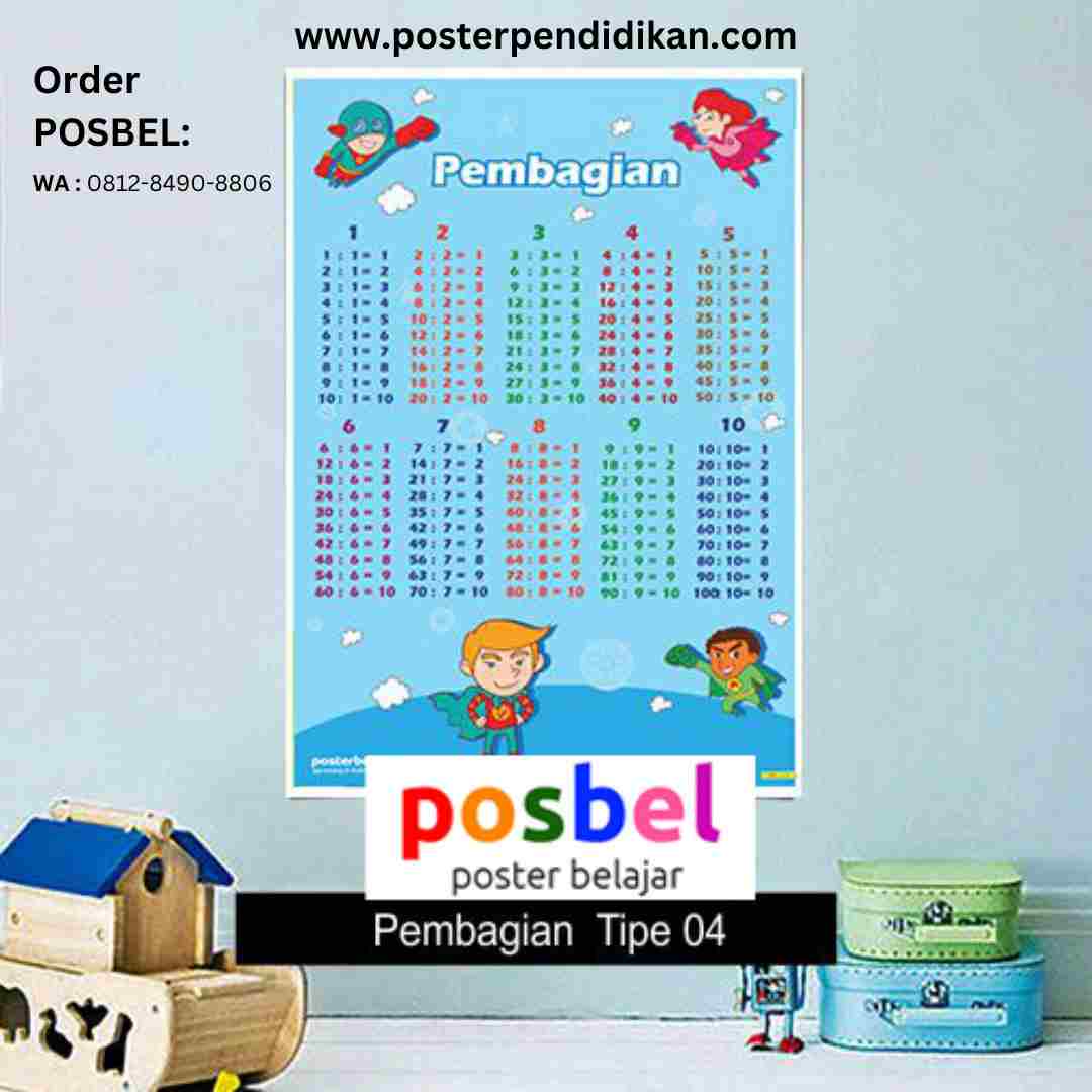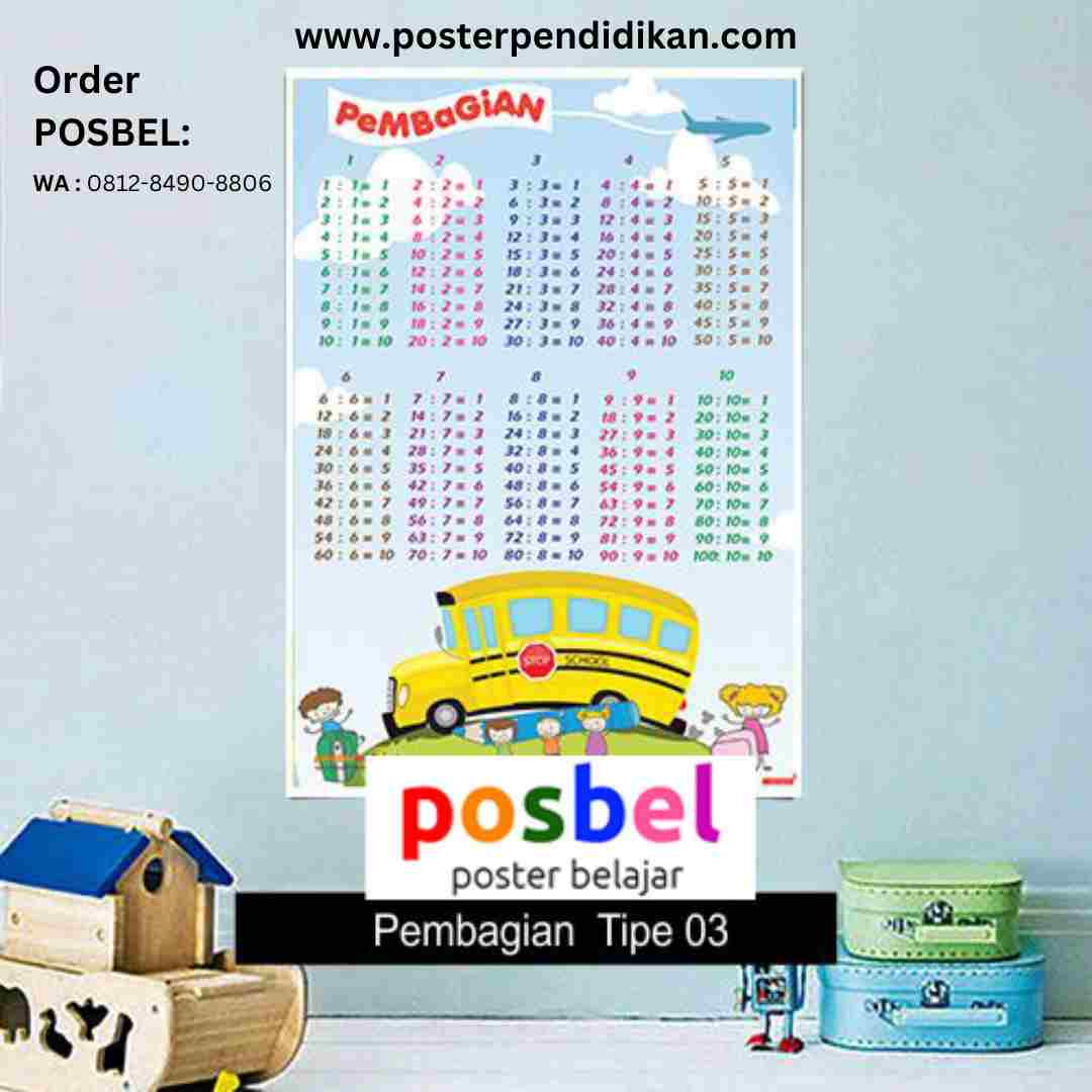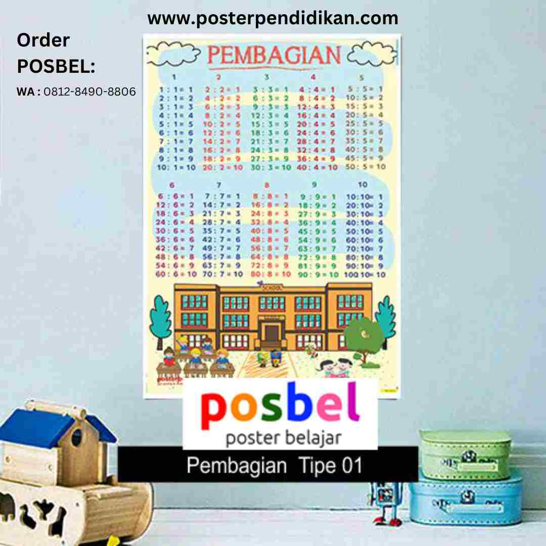 Kami sedia dan jual poster pendidikan pembagian matematika POSBEL untuk membantu belajar dan edukasi anak SD. HP/WA : 0812-8490-8806. Harga hanya Rp 15rb/lembar. Diskon 20% jika beli min 5 lembar (bisa campur seri lainnya).