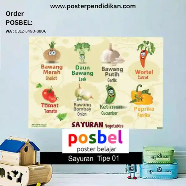 Kami sedia dan jual poster sayuran terdekat untuk belajar dan edukasi anak dalam mengenal sayuran. HP/WA : 0812-8490-8806. POSBEL memiliki 119 tipe yang bisa dipilih sesuai dengan kebutuhan anak. Hanya 15rb/lembar. Diskon 20% jika beli min 5 lembar (pilihan bisa campur).